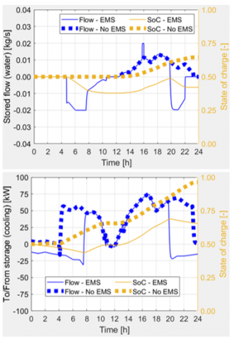 Figure 6. 24-hour simulation: properties related to the storage tanks for generated water (up) and cooling energy (down) (comparison between the “EMS” and the “No EMS” cases)