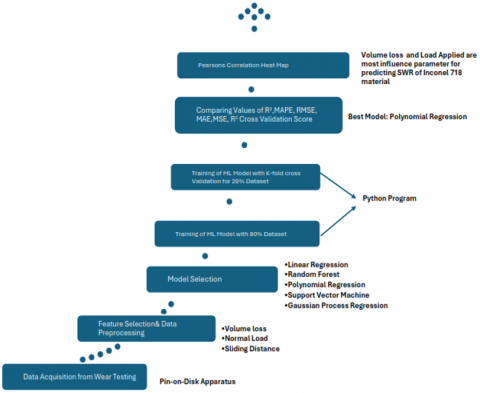 The methodology adopted in this research paper is represented as stepwise stages in Prediction of Specific wear rate of Inconel 718 flowchart as shown in Figure 2, from data acquisition to Pearson correlation heatmap.
