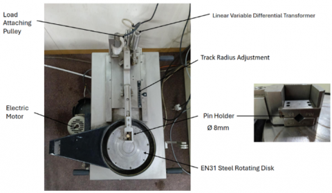 The pin-on-disk apparatus is a widely used tribological testing device designed to evaluate materials' wear rates, and lubrication properties under controlled conditions. This apparatus is involved in various fields, including aerospace, polymer science, corrosion studies, biotribology, and industrial applications. The pin-on-disk apparatus consists of an immobile pin pressed against a rotating disk. The wear and frictional forces are measured as the disk rotates, simulating sliding contact between two surfaces [34]. A personalized, low-cost pin-on-disk apparatus was designed for testing polymeric materials under dry-sliding conditions, demonstrating its utility in measuring friction coefficients and wear rates with high precision [35]. In biotribology, a multidirectional motion pin-on-disk apparatus was developed to study the wear behaviour of prosthetic joint materials, highlighting the influence of shear stress in multidirectional sliding [36]. The apparatus is also used in industrial settings to evaluate the effects of lubrication on wear parameters of metals, showing significant reductions in friction with the application of lubricants [37]. Figure 3 shows various components of the disk apparatus, which consists of a pin holder, a provision for adding weights, a linear variable differential transformer (LVDT) sensor to measure the linear displacement of the pin, and an adjustable track diameter for measuring wear volumes of specimens.