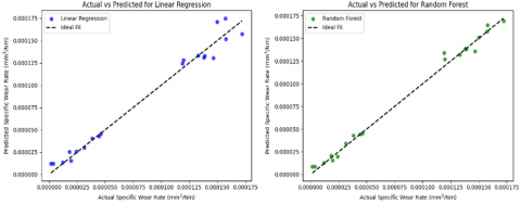 Figure 5. Plots of actual vs predicted specific wear rate by supervised ml models