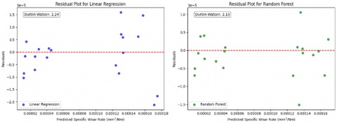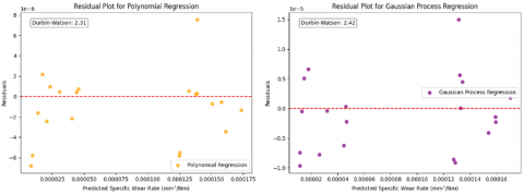 While, Linear Regression model captures linear relationships adequately but shows systematic limitations in predicting extreme wear rates (i.e., residual error increases as specific wear rate increases), Random Forest model shows randomly distribution of residual points which indicates no systematic pattern but it has higher magnitude of residual error than Polynomial Regression model. which provides an advantage to Polynomial Regression over random forest model. The Gaussian Process Regression shows dense cluster regions and some sparse regions with fewer data points showing wider residual spread. This indicates that it is not showing consistent performance as Polynomial Regression model across the entire wear rate prediction space. Each plot includes a Durbin-Watson statistics which quantify degree of autocorrelation and these values must be close to 2 because then and only then the model said be independent, unbiased. Therefore, these residual plots and Durbin-Watson statistics together confirms all four models are supporting the robustness of wear rate predictions for Inconel 718 material.