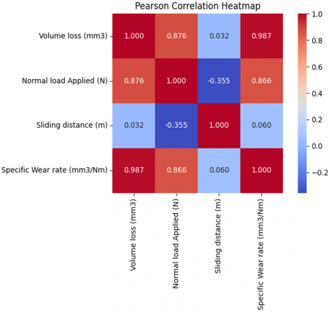 Figure 7. Pearson correlation heatmap for specific wear rate