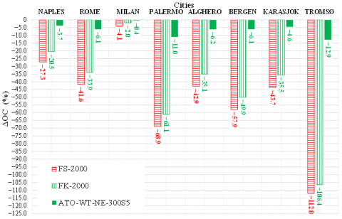 where, REVel,sold is the annual revenue obtained thanks to the electric energy sold to the grid, UCel,sold,i and UCel,imp,i are, respectively, the unit price of electric energy sold to the grid and the unit cost of electric energy imported from the grid. In the case of the Italian cities, the values of UCel,imp,i have been obtained according to the values indicated in the study [32] by considering the zone of Italy where the city is located (Central-South, North, Sicily, Sardinia). With reference to Norwegian cities, the values of UCel,imp,i have been defined according to those suggested by the federation of the European electricity industry based on the zone of Norway (Norway_4 and Norway_5) [33] where the considered cities are located. The values of UCel,sold,i for the selected Italian cities has been adopted according to the study [34]. In the cases of the Norwegian cities, the unit price of electricity sold to the grid UCel,sold,i has been assumed equivalent to the unit cost of electricity purchased from the grid UCel,imp,i when the electrical energy production exceeds the demand of the individual residential building [35]. According to studies [32-35], the maximum UCel,imp,i and UCel,sold,i for the Italian cities is equal to 400 €/MWh and 170 €/MWh, respectively, while for the Norwegian cities they are both equal to 332 €/MWh. Figure 10 shows the results in terms of $\Delta$OC upon varying both the city and the SWT model. This figure reports only negative values (whatever the city or the SWT model is), so the proposed scenarios with the SWTs always allow to decrease the operating costs in comparison with the reference scenario. In further detail, this plot underlines that, for a given city, the utilization of the SWTs decreases the operating costs in comparison to the reference scenario from a minimum of –0.4% in the case of the HASWT ATO-WT-NE-300S5 operating in Milan up to a maximum of –112.0% in the case of the VASWT FS-2000 operating in Tromsø.
