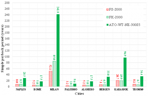 Figure 11 reports the values of SPB upon varying both the city and the SWT model. This plot highlights that SPB ranges from a minimum of 2.8 years (obtained when the HASWT FK-2000 operates in Palermo) up to a maximum of 241.8 years (that is achieved for the HASWT ATO-WT-NE-300S5 installed in Milan). The HASWT FK-2000 and the VASWT FS-2000 are characterized by similar SPBs, that can be assumed as suitable from an economic point of view (except in the case of Milan) taking into account that the expected SWTs lifetime is about 20÷25 years; the HASWT ATO-WT-NE-300S5 is characterized by much larger SPBs in contrast to the other SWTs, with acceptable values only when it is installed in Palermo, Rome and Alghero.