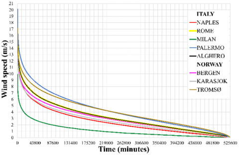 Figure 3 reports the annual wind velocity-duration diagrams upon varying the city (according to study [28]), with the data in descending order. This plot indicates that Palermo is characterized by the largest average annual wind speed (4.24 m/s), while the minimum average annual wind velocity (1.14 m/s) corresponds to the city of Milan.