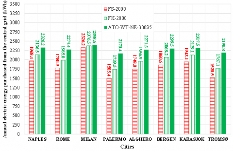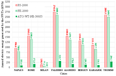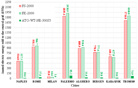 This plot indicates that the values range from a minimum of 1.6 kWh in the case of the HASWT ATO-WT-NE-300S5 operating in Milan up to a maximum of 1930.9 kWh in the case of the HASWT FK-2000 installed in Palermo. For a given city and SWT model, the values reported in Figure 6 represent a significant percentage of the corresponding values of generated electricity (reported in Figure 5); this percentage ranges between 40.3% (in Milan) and 67.1% (in Palermo) for the VASWT FS-2000, between 57.8% (in Milan) and 74.3% (in Palermo) for the HASWT FK-2000, and between 13.4% (in Milan) and 26.3% (in both Tromsø and Palermo) for the HASWT ATO-WT-NE-300S5. These values indicate that coupling the selected SWTs with electric batteries could significantly enhance the related performance.