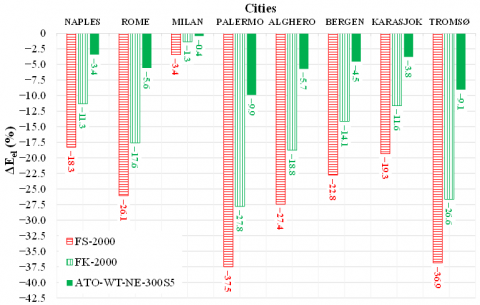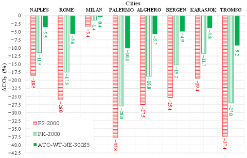 where, $u_x^E$ is the energy output-based emission factor of x per unit of E. CO2 emissions generally show to be quantitatively more significant than emissions of other pollutants. The CO2 emission factor associated to the electricity generation in Italy $u_{\mathrm{CO}_2}^{E_{\mathrm{el}}}$ depends on the location, the day of the year as well as the time of the day. According to the values suggested in the studies [30, 31], this factor ranges between 41.3 gCO2/kWhel and 827.3 gCO2/kWhel for the Italian cities and between 0 and 56.1 gCO2/kWhel for the Norwegian cities. The percentage difference $\Delta \mathrm{CO}_2$ between the values of global equivalent CO2 emissions in the case of the proposed scenarios (including the SWTs) with respect to the values of the reference scenario (without the SWTs) has been derived as follows: