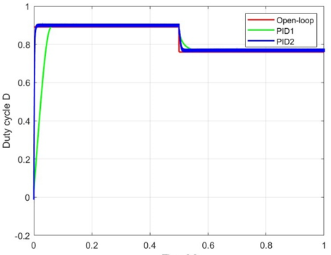 Figure 10 shows the duty cycle variation for open-loop, PID1 (single-loop), and PID2 (double-loop) control methods. The open-loop which is included only as a benchmark (worst-case), maintains a fixed duty cycle with no corrective adjustment, which can lead to large voltage and current deviations across the MOSFETs, potentially increasing device stress. By using Taylor expansion, we can arrive at the following equations: