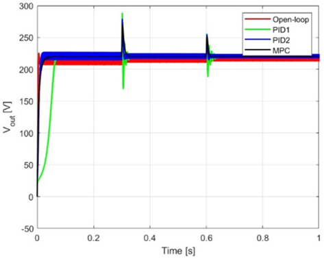 Figure 11. Output voltage under load variation (100 Ω to 200 Ω). The open-loop case is shown as a benchmark and exhibits poor regulation versus closed-loop controllers