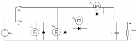 When the MOSFET switches (Q3, Q4) are turned ON, the inductors release their stored energy, which adds to the input voltage Vin, thereby boosting the output voltage Vout.