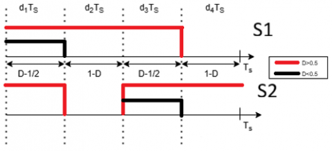 From the diagram in Figure 2, we can observe that the switching signals of S1 and S2 are phase-shifted to ensure interleaving. Depending on the duty cycle D, two different operating cases are identified: