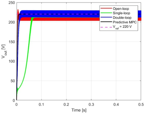 Finally, the predictive control (FCS-MPC) method demonstrates the best overall performance, with the fastest response (~8 ms), zero overshoot, negligible steady-state error, and strong adaptability to load changes. These features establish predictive control as the most suitable choice for high-performance, time-critical applications where minimal transients are essential. While double-loop control remains a reliable alternative for general use, single-loop voltage control and open-loop control are not recommended in scenarios where performance and stability are critical.
