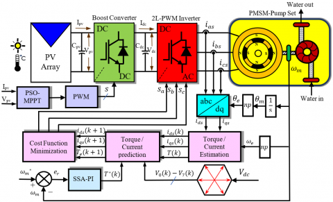 The issues of climate changes, the absence of electricity in rural areas, and rising fossil fuel prices have encouraged consumers to use alternative energy sources for electricity generation. Solar photovoltaic (PV) is considered one of the fastest-growing renewable energy sources due to its increased efficiency, scalability, modularity, and silent operation [1]. Water purifying and pumping systems are vital and cost-effective applications for PV systems, especially in off-grid conditions and remote regions. Furthermore, diesel pump fuel costs and regular maintenance are two to four times higher than those of PV water pump systems [2]. These pumps depend highly on the control strategies of the electric motors to adjust the discharge rate. PMSMs have been widely used in PV water pumping systems for their inherent high efficiency, higher power density, excellent torque density, best power factor, and compact size [3, 4].