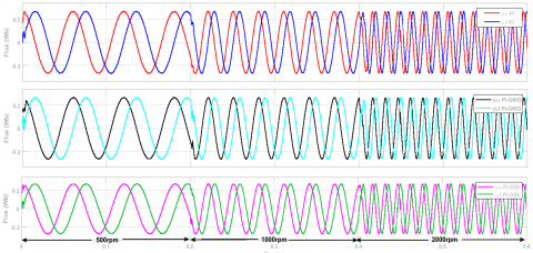 The PMSM flux linkage in ($\alpha-\beta$) coordinate at constant speed (750 rpm) and variable load torque (2 Nm,3.5 Nm, and 1 Nm) is illustrated in Figure 15. It is noted that the flux linkage dynamic response using the proposed PI-SSA controller is less distorted at the starting time compared to the other two controllers and similar in the steady state.
