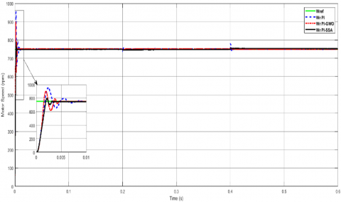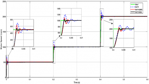 Figure 7 shows the motor speed response to a step-change in reference speed when the motor speed instantly increases from 0-500 rpm at a time range of 0-0.2 s, followed by an increase in speed from 500-1000 rpm at a time range of 0.2 s-0.4 s, and finally by the rise in the speed from1000-2000 rpm at a time range of 0.4 s-0.6 s with a rated load torque of 3.5 Nm. The step change in the motor speed is considered the pumping system's actual performance when the water flow rate is not constant. The steady and dynamic state responses of the proposed PI-SSA controller are verified by comparing their results with those of the PI and PI-GWO controllers. The proposed PI-SSA controller improves the rise time by 21.17%, 3.64% at 500 rpm, 22.81%, 4.33% at 1000 rpm, and 24.93%, 7.44% at 2000 rpm over PI and GWO-PI controllers. Furthermore, the settling time increased by 80.1%, 38.1% at 500 rpm, 75.91%, 15.77% at 1000 rpm, and 81.15%, 21.91% at 2000 rpm over PI and PI-GWO controllers. Also, the overshoots were enhanced by 84.94%, 41.43% at 500 rpm, 87.73%, 30.14% at 1000 rpm, and 90.17%, 45.35% at 2000 rpm over PI and PI-GWO controllers. Finally, the undershot improvement of 70.53%, 32.52% at 500 rpm, 78.57%, 49.02% at 1000 rpm, and 72.12%, 31.42% at 2000 rpm over PI and PI-GWO controllers. The superior transient performance of rise time, settling time, overshot, and undershot at different operation conditions is due to the inherent robustness and stability of the proposed technique.