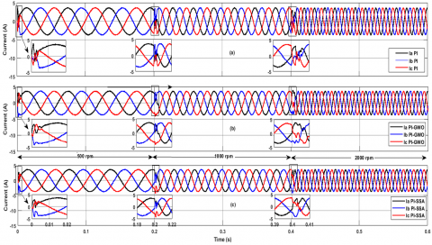 Furthermore, the corresponding three-phase motor current waveforms at motor speeds (500 rpm,1000 rpm, and 2000 rpm) are observed in Figure 8. It is evident that the PI, PI-GWO, and proposed PI-SSA controllers generate similar sinusoidal stator current waveforms at steady state conditions, but when using fast fourier transform (FFT) on these waveforms, the proposed PI-SSA has the lowest line current total harmonic distortion (THDi) factor and smallest line current disturbance during a sudden change in motor speed at 0.2s and 0.4s. The THDi of the motor line currents are depicted in Table 8. The average value of THDi was 15.55% using a conventional PI controller which led to producing high harmonic contents but using the PI-GWO this value was reduced to 7.7% which can be considered as a relative improvement and the best performance among all controllers comes when using the PI-SSA controller where the THDi was 19.4% improved over conventional PI controller which indicates more sinusoidal smoother motor currents.