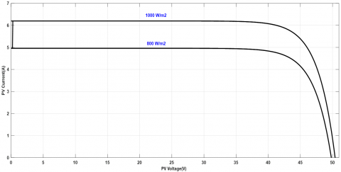 The power versus voltage of the PV module with the corresponding current and voltage characteristics at 1000 w/m2 and 800w/m2 solar irradiation are illustrated in Figures 5 and 6, respectively. The power versus voltage and short circuit current versus voltage of the PV module are identical to the data given in Table 1. This process will confirm that the generated power by the PV module is similar to that of a real module.