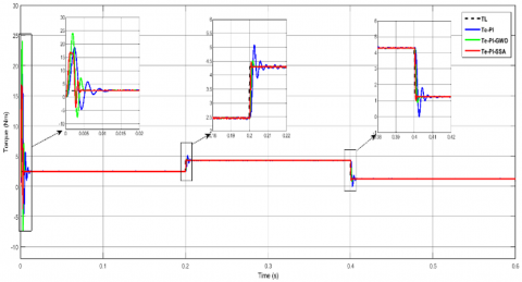 The electromagnetic torque in the variation of load torque (2 Nm, 3.5 Nm, and 1 Nm) and constant motor speed is demonstrated in Figure 14. The MATLAB simulation results reveal that the suggested PI-SSA controllers improves the dynamic performance of the developed motor torque even when the motor load torque increases from 2 Nm to 3.5 Nm at 0.2 s and steps down to 1 Nm at 0.4 s.