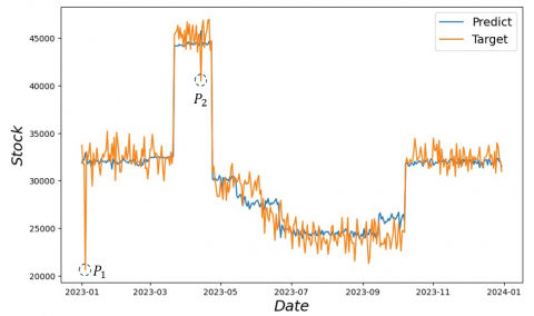 This limitation indicates that the model tends to smooth its predictions, hampering its ability to react to the abrupt fluctuations present in real data. Indeed, while it is capable of identifying broad general trends in stock levels, it fails to faithfully reproduce the dispersion and variability observed. It therefore seems crucial to consider adjustments or explore more advanced methods to enable the model to better handle these significant fluctuations and thus improve its accuracy, particularly at the critical thresholds of 25,000 and 35,000 units.