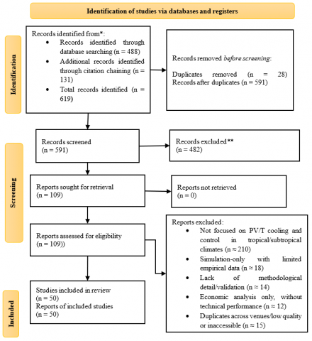 To ensure reproducibility and transparency of the literature search process, this review explicitly identifies the academic databases used for source retrieval. The search was conducted across major indexing platforms, including Scopus, Web of Science, IEEE Xplore, ScienceDirect, SpringerLink, and Google Scholar, covering peer-reviewed articles published between 2010 and 2025. Additional sources were obtained through backward and forward citation tracking to expand the comprehensiveness of the dataset. A total of 619 initial records were collected across these databases before applying the inclusion and exclusion criteria. These clarifications strengthen the methodological rigor and enable future researchers to replicate or extend the literature search with consistency. After completing the initial collection stage, a structured screening process was conducted to refine the dataset and ensure that only studies with strong methodological relevance were retained. From the total 619 records gathered, 28 duplicate entries were removed, resulting in 591 unique publications eligible for preliminary assessment. Title and abstract evaluation led to the exclusion of 482 papers that did not align with the core research focus, leaving 109 articles for full-text review. A subsequent full-paper assessment removed 59 studies due to reasons such as insufficient experimental detail, absence of PV/T system integration scope, or lack of quantitative performance indicators. Ultimately, 50 studies were identified as highly aligned with the objectives of this review and were therefore included in the synthesis and comparative analysis, as illustrated in the PRISMA flow diagram presented in Figure 1.