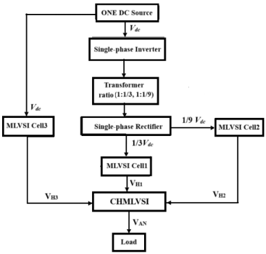 The multilevel inverter allows its output to reach a smoothly high voltage with low harmonics. The level capacity can be improved by replacing the equal DCVSs with unequal different values of input DC voltages for each H-bridge cell. The contribution of this study is to get different AC voltage levels with minimum THD values depending on ONE DCVS. The ONE DCVS gets from a battery or solar cell is divided into three unequal isolated values. It is fed to a single-phase DC/AC high-switching inverter and the output is connected to a single-phase, three-winding, high frequency power, transformer as shown in Figure 1. The transformer outputs fed two single-phase uncontrolled AC/DC rectifiers to achieve 1/3Vdc and 1/9Vdc values with the ONE DC voltage (Vdc) as inputs for the three H-bridge inverter cells. The output voltages of each inverter cell (VO1, VO2, and VO3) produce the wanted output voltage (VAN) of the designed MLVSI: