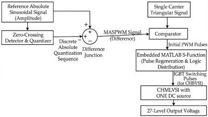 In MLVSI applications, specific numbers of PWM strategies are used. The PWM strategies can be categorized into fundamental frequency switching modulation strategy, space-vector PWM strategy, and carrier based PWM strategy, which has one-carrier or more [10]. In this paper, a MASPWM method proposed by the studies [22-24] is adopted using a triangular as a carrier signal. The controller circuit employs a single-carrier approach. The proposed controller technique operates by generating an absolute sinusoidal reference that defines the target voltage amplitude. Figure 3 shows the flowchart of the MASPWM controller that tracks the zero-crossing points of this reference to create a corresponding discrete, quantized signal. The core modulation signal is then derived by subtracting this quantized sequence from the original absolute reference; this difference is what is compared against the single triangular carrier to generate the PWM pulses. To execute this, a custom MATLAB S-function controls the logic, distributing firing pulses to the IGBTs based on specific switching states illustrated in Table 2. This control scheme can successfully synthesize output voltage levels from 3-level to 27-level. Different output voltage levels can be obtained based on the DCVS values that feed the CHMLVSI. Therefore, due to unequal DCVS of each inverter cell (Vdc, 1/3Vdc, and 1/9Vdc), thirteen level appears in the positive side and thirteen level in the negative side with zero level to get 27-level output voltage as clarified in Table 2.