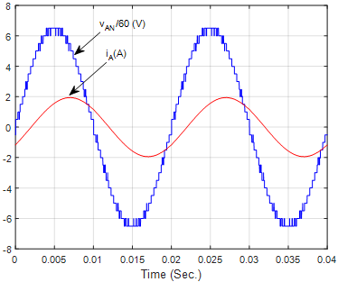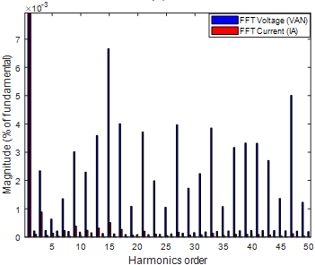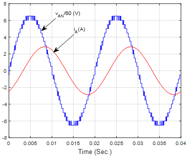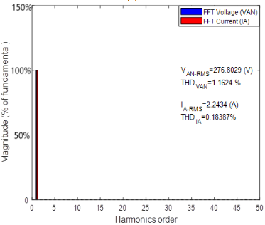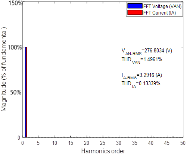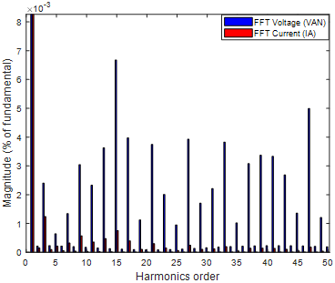 This reduction confirms the superiority of the MASPWM technique in synthesizing a high-quality sinusoidal waveform. The amplitude of the low harmonic orders shown in Figure 5(c) and Figure 6(c) is around zero with insignificant values of the higher harmonic orders. The whole system's efficiency is 99.7254% at a power factor of 0.8 and 98.9785% at a power factor of 0.5. The efficiency was derived directly from the simulation environment by monitoring the instantaneous input and output power.