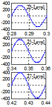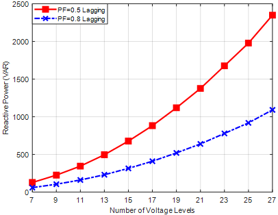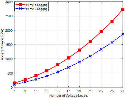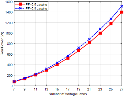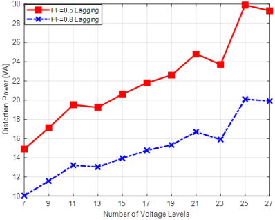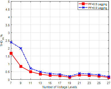 The steady state and dynamic waveforms of the VAN at levels from 15 to 27 are illustrated in Figure 7. Specifically, the figure shows the transition from 15-level operation to 27-level operation (changing the reference voltage amplitude). This confirms the controller's ability to track sudden changes in the reference signal without instability. The THD values of the VAN and IA at different voltage levels with different RL loads are illustrated in Figure 8. To verify these results, the apparent, real, reactive, and distortion power components are taken into account at various levels as explained in Figure 9. These power waveforms explained the effect of increasing loads and voltage levels on the amount of power levels.