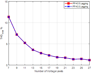 Figure 8. THD of the output (a) voltage and (b) current of the multilevel CHBVSI at different power factors