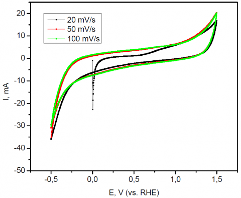 A represents the responses in Figure 12 obtained by CV between 0.4 and 0.8 V (vs. RHE). The ratio between anode and cathode parts for electrodes at different scan rates demonstrates similar to conventionally observed capacitive waves.
