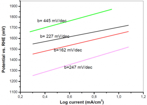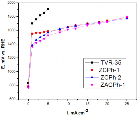 In addition, the exchange current-density values (j0) for the OER are very low beginning from logarithm - 6,17 mA.cm-2 for ZCPh's samples were found from Tafel slope extrapolation. The obtained lower oxidation-reduction rate dates at equilibrium j0 are probably due to front reactions in the study of the electrochemical systems, the nature of materials etc.