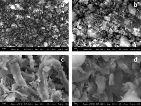 Figure 7. SEM images of sample NZ at magnification of (a) 1000 and (b) 3000 and for sample ZCPh-4.1 at magnification of (c) 1000 and (d) 3000