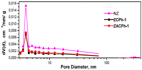 Nitrogen adsorption/desorption isotherms of NZ, H+-NZ after the addition of CPh (ZCPh-1) and ACPh (ZACPh-1) are presented in Figure 8.