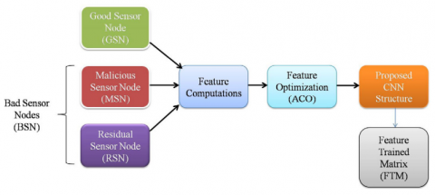 All MANET environment networks are having Good Sensor Nodes (GSN) initially and they become Bad Sensor Nodes (GSN) due to internal and external attacks. Therefore, the MANET environment networks have both types of GSN and BSN. These BSN are categorized into Malicious Sensor Nodes (MSN) and Residual Sensor Nodes (RSN). The formation of these MSN and RSN may degrade the performance efficiency of the entire MANET environment network. Therefore, it is necessary to detect and mitigate these BSN from the network. In this work, GSN and BSN are classified using the proposed CNN structure. This proposed system consists of feature computations, feature optimization through Ant Colony Optimization (ACO) Algorithm and the optimized features are classified through the proposed CNN structure. Figure 2(a) shows the proposed ACO-CNN training phase and Figure 2(b) shows the proposed ACO- CNN testing phase.
