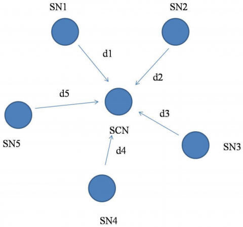 Compute the distance between Sensing Center Node (SCN) to all other surrounding sensing nodes SN1, SN2, SN3, SN4, and SN5, using the following equations.