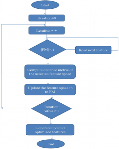 In this paper, during training the FM is computed individually for GSN, MSN and RSN and they are individually trained by the following proposed CNN architecture for the classification of center sensing node into any one of the sensing node category as GSN or MSN or RSN. The size of this constructed FM is large due to the computation of all features individually for all the sensing nodes in MANET environment. This cannot be directly processed by the proposed CNN architecture. Hence, this constructed FM from the entire MANET architecture should be reduced using feature optimization algorithm. Figure 4 shows the flow of ACO Algorithm for FM optimization. The entire constructed FM is fed into ACO algorithm which is given in Figure 4. In this working flow of FM optimization, each element in the FM is compared with 't', which is the average value of all theelements in FM. If the element in FM is greater than the computed 't', then the computation of distance metric of the selected feature space is processed and the feature space is updated into FM. Now, the iteration value is compared with 't' which produces the updated optimized FM (OFM) if the condition is satisfied, as depicted in Figure 4.