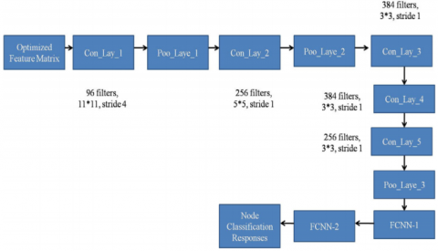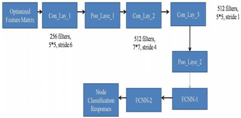 In this work, two CNN architectures are used to perform classification process of sensing nodes in MANET into either GSN or BSN. The existing AlexNet CNN architecture is designed using five Convolutional layers along with three pooling layers and two Fully Connected layers as illustrated in Figure 5(a). The first Con_Lay_1 in this architecture constitute using 96 filtering elements with $11^* 11$ kernel size along with stride 4. The input Optimized Feature Matrix (OFM) is passed through Con_Lay_1, to produce the matrix which is greater than the size of the OFM with negative index values. These negative index values are removed by passing the output of Con_Lay_1 to the Poo_Laye_1, which is operated using Max function. The output of Poo_Laye_1 is passed through Con_Lay_2, which constitute using 256 filtering elements with $5^* 5$ kernel size along with stride 1. In order to remove the negative index values in this output, the output of Con_Lay_2 is again passed through Poo_Laye_2. The output of Poo_Laye_2 is now passed through the three consecutive elements Con_Lay_3 , Con_Lay_4 and Con_Lay_5. The design specifications of these three consecutive elements are given in Table 1. Now, the response from Con_Lay_5 is passed through Poo_Laye_3 and its output is passed through FCNN-1 (4096 neurons) and FCNN2 (1028 neurons). The final output from FCNN-2 gives the classification indexes as GSN, MSN or RSN.