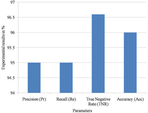 Figure 6 is the graphical illustration of the proposed ACOCNN system with various parameters Precision, Recall, True Negative Rate and Accuracy. From this graphical analysis of various performance parameters, the precision and recall have more or less similar values which are 95% and it is most suitable values for the proposed MANET system. Further, the value of TNR is high which is 96.6% which illustrates that there is few malicious nodes presence in the proposed MANET system. Finally, the graph illustrates the accuracy value which is 96% which highlights the performance efficiency of the proposed MANET system.