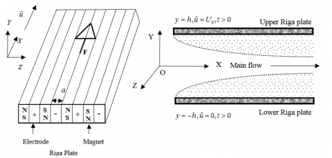 The Riga plate is considered by Gailitis and Lielausis [10] to build an applied magnetic and electric fields which consequently generates Lorentz force parallel to the wall due to control the flow of fluid. The EMHD free-convection boundary-layer flow from a Riga-plate has been investigated by Pantokratoras and Magyari [11]. Ahmad et al. [12] studied the flow of nanofluid past a Riga plate. The squeezing flow past a Riga plate with chemical reaction and convective conditions has been considered by Hayat et al. [13]. Iqbal, et al. [14] considered the numerical investigation of nanofluidic transport of gyrotactic microorganisms submerged in the water towards Riga plate. A numerical approach for the radiative Williamson nanofluid flow over a convectively heated Riga plate with chemical reaction has been investigated by Ramzan et al. [15]. Ramesh and Gireesha [16] studied the non-linear Radiative flow of nanofluid past a moving or stationary Riga plate. The analytical investigation of third grade nanofluidic flow over a Riga plate using Cattaneo-Christov model has been considered by Naseem et al. [17]. Anjum et al. [18] investigated the influence of thermal stratification and slip conditions on stagnation point flow towards variable thick Riga plate.