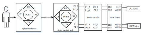 The power ports of the ZigBee coordinator, ZigBee terminal nodes, and DC motor driver are connected to a 5V DC power supply. The P1_7, P1_6, P1_5, and P1_3 of the ZigBee terminal nodes are connected to the P1_7, P1_6, P1_5, and P1_3 of the vehicle’s master controller, and the P2_0, P2_1, P2_2, and P2_3 of the master controller are connected to the IN1, IN2, IN3, and IN4 of the DC motor driver, respectively. The OUT1, OUT2, OUT3, and OUT4 of the driver are connected to the positive and negative electrodes of the two DC motors.