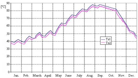 Figure 7 shows the experimental indoor and outdoor air temperature throughout the test period considered. Figure 8 shows the trend of solar radiation measured by the pyranometer located on the collectors plane, inclined of 39° respect to the horizontal plane. Figure 9 shows the experimental temperatures of the water in the two tanks.
