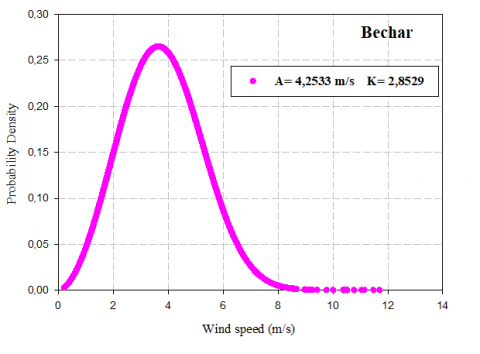 Figure 2 represents the annual Weibull distributions for both Bechar and Tindouf sites; according to the results obtained, we find that the wind speed covers an interval of up to 8 m / s for the Bechar site and 10 m/s for the Tindouf site. The scale factor values for Bechar and Tindouf are respectively 4.2533 m/s and 5.7846 m/s. The shape of the two curves is determined by a shape parameter equal to 2.8529 for Bechar and 3.4964 for Tindouf.