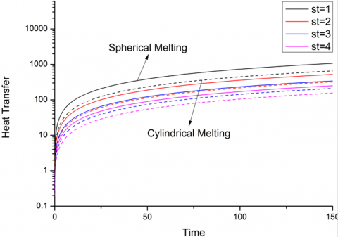 The variation of dimensionless heat transfer with time in spherical and cylindrical melting for different values of Stefan’s number is shown in Figure 3. During initial time of melting of PCM, the heat transfer increases more rapidly because of large temperature difference available between two phases. But with time, heat transfer becomes linear because the temperate difference between two phases decreases. This means that, except the initial time period, the heat transfer process is very slow. The time taken to absorb a certain amount of heat in cylindrical process is higher than that of spherical melting process.