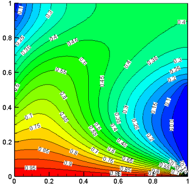 $\frac{\partial T}{\partial t}+u\frac{\partial T}{\partial x}+v\frac{\partial T}{\partial y}=\alpha (\frac{{{\partial }^{2}}T}{\partial {{x}^{2}}}+\frac{{{\partial }^{2}}T}{\partial {{y}^{2}}})$ (4)