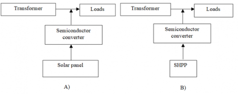 To improve the quality of the voltage in the distribution network, it is necessary to balance the voltages, for which balancing devices are used in the transformer [6-8], which increases the cost of 6-10/0.4 kV transformers. Note that after balancing the voltage, the transformer operates in overload mode. To eliminate this mode, a semiconductor converter with renewable energy sources (RES) can be connected in parallel to the transformer. Depending on the location of consumers, you can choose the type of RES source. For an urban network, this can be a solar panel (Figure 1a), and for rural networks, a mini hydroelectric power station with a semiconductor converter (Figure 1b). When solar panels (SP) operate in parallel with a city grid or mini-hydro electric power plants with a semiconductor converter (S/C) in rural networks, due to the control of semiconductor converters, voltage unbalance is completely reduced, thereby increasing the quality of electricity, reducing overload.
