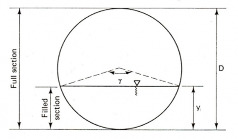where, D is channel diameter, γ is water surface angle in radians (which depends on the flow depth yn), n is Manning's roughness coefficient, S is the bed slope of channel, and h=yn/D.