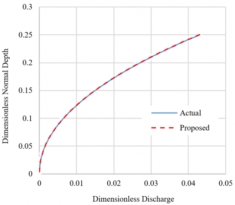 Figure 4 shows the dimensionless critical depth from the proposed equation and the actual critical depth through a circular channel. It can be seen a remarkable match between the expected and actual results.