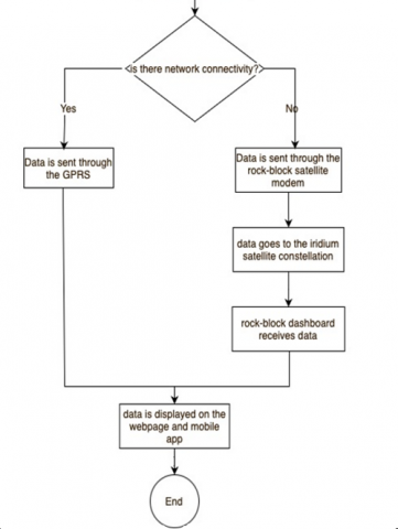 The onboard micro-controller within the head strapping devices collects the data from the temperature sensors and the magnetometer as well as the GPS and routes the data through the Lora RF module Sx1278, so once the data is in the air, the second Sx1278 in a fixed based station receives the same packet and this packet is routed to the micro-controller which we already have available. Now the controller on the base station has two network interfaces, one is the satellite modem and the second is General packet ratio service (GPRS) modem, depending on the availability of the Greedy perimeter stateless routing (GPSR) network, the controller can decide to use one of the two to route the received packet to the internet, now if there is GPRS network, the controller will maintain a Message Queuing Telemetry Transport (MQTT) connection server, so MQTT is an IOT device communication protocol that sends data between a device and server, so assuming we have a back-end server that is addressed e.g., to abc.com, the device simply sends this data over to the server there using the MQTT protocol, but should a GPRS network not be available, the data is routed through the satellite modem whose communication is between itself and the micro-controller uses a simple serial interface and the way the iridium modem we are using behaves such that any data sent over the interface to the modem, the modem picks it up and sends that data through the iridium satellite constellation, so once the data is sent over the satellite constellation, the iridium takes care of routing the data back to the web server and with that we can configure on our iridium dash board otherwise say that once we receive a data from this device simply send it through a web hock to a web server at any or given address, so we could have reconfigured the address of our web server on the iridium dash board, such that once their device send its data to their back-end cloud we will route it back to our same web server that is at abc.com. For example, once the data arrives on our back-end server, we can decide to process it by maybe saving the data in our database, and of course, once that is done, we want to route the data back to the mobile app of the end-user. Good for us, the mobile app of the end-user is using MQTT communication, which is backed up to our back-end server as well, so that is how data is routed. Figures 2 and 3 show the block diagram which summarizes the explanation. Figure 4 shows the flowchart of the working principle of the proposed system.