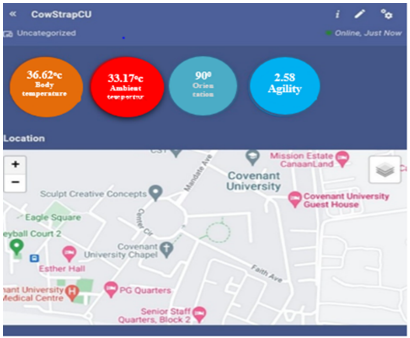 A test was conducted to verify the functionality of the electronic head-strap device. Cattle were worn the prototype of the developed head-strap and guided by a hired herder around the campus environment with the permission of appropriate authorities and the results obtained are as presented in this session. From Figure 5, you can see it was attached to the head of a cattle to collect data from the cattle. Figure 6 is the mobile application (Ismart app) used to read the result. Ismart app is a mobile application software pre-programmed platform for researchers and other commercial vendors to integrate and test their devices. The orange circle reads the results of the body temperature test; the red reads the environmental temperature; the blue reads the agility test and below that is a map showing the location of the cattle. Table 1 displays data extracted from website. All data displayed on the website is in real-time and data history is also displayed. From the various tests carried out, the mobile network functions as intended and works properly. The results of the data on the mobile app and website for the temperature sensor, the ambient temperature, the agility test, and the GPS are gotten in real time. When the satellite module was tested in the absence of GPRS, it was discovered that it takes approximately 2 minutes for the Iridium satellite to send the message to the Rockblock site and have an impact on the mobile Apps (Ismart). This reason for the delay is as novelty modelled and derived mathematically in section 4.1.