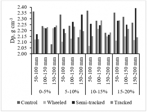 Particle density values ranged from 2.13 to 2.27 g/cm³ at depths of 100-150 mm, indicating an increase in density. At depths of 150-200 mm, particle density values ranged from 2.14 to 2.34 g/cm³. A similar increasing trend was also observed for slopes of 10-15% and 15-20%. Across all types of machines, particle density increased at sampling depths of 50-100 mm, with values ranging from 2.07 to 2.26 g/cm³.
